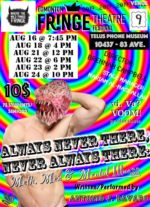 This solo show is about a local Edmonton drag queen’s lifelong relationship with Methamphetamine. A non-narrative experience told through a wild variety of vignettes: backstage at a local gay bar before a drag show, game shows about mental illness, scramblings in the search for enlightenment, rumbling childhood images of drugs in St Albert, and more. No reviews were given for this beautiful and important show at the 2019 Edmonton Fringe.